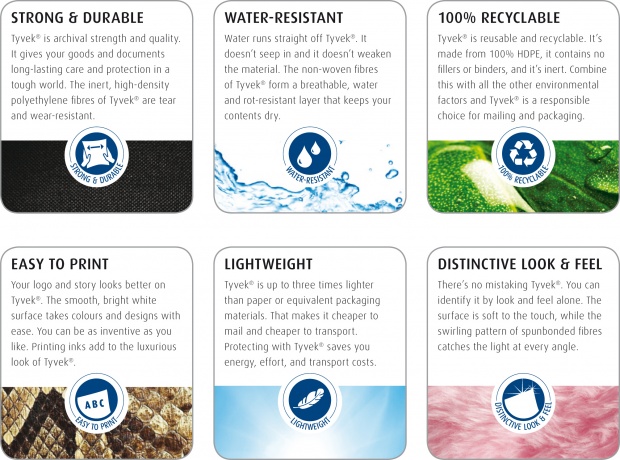 Tyvek® ist kein Papier. Es ist ein geschmeidiges Vlies aus 100% hochverdichteten Polyethylenfasern. Es verfügt über eine verwirbelte Textur und einen weich schimmernden Glanz. Es fühlt sich so glatt an wie Papier und so weich wie Stoff.